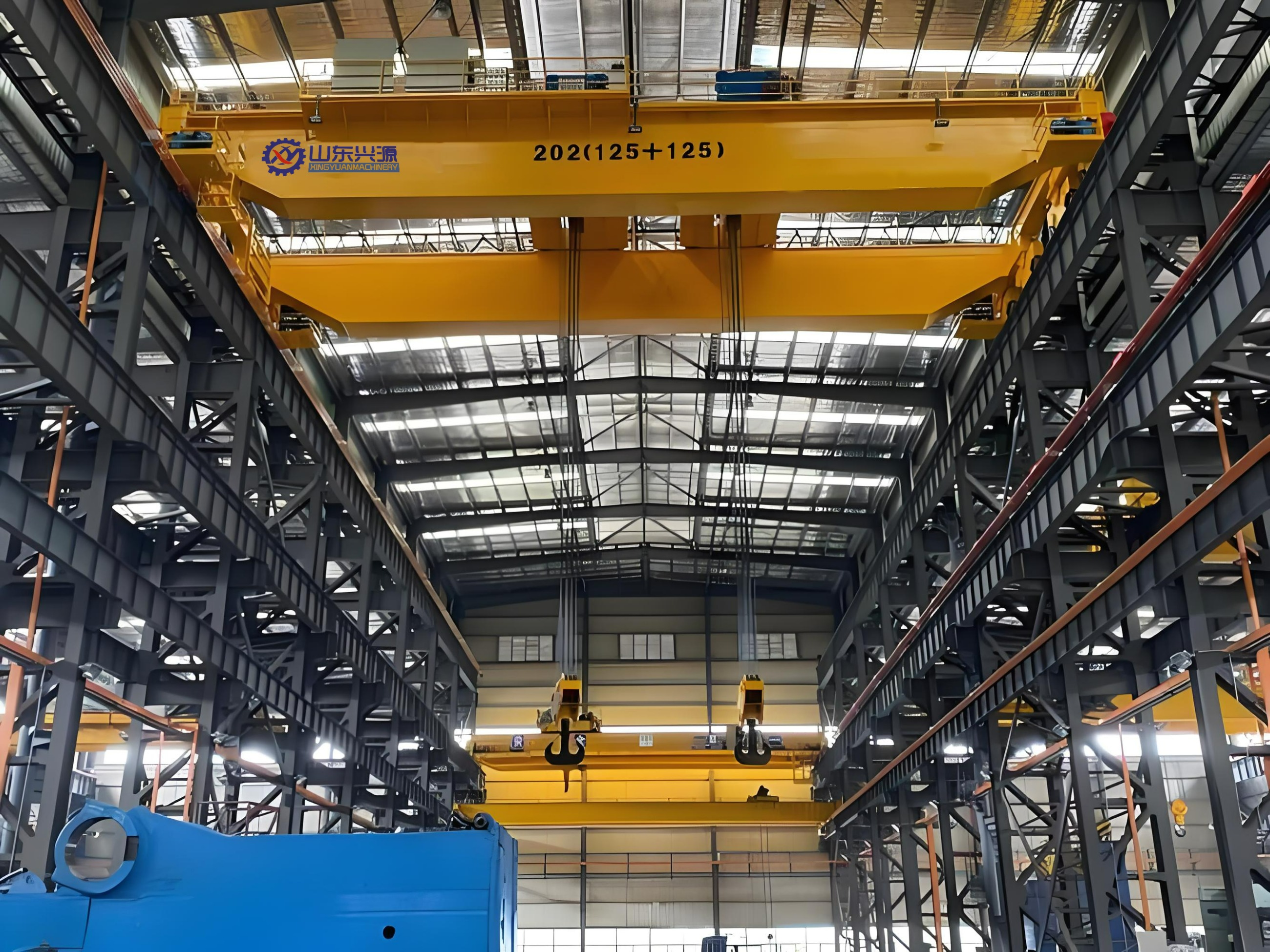 ?是在QD型橋式起重機的基礎(chǔ)上,將單小車改為雙小車,可單鉤獨立或雙鉤同時吊運物件,主要由橋架、大車運行機構(gòu)、小車、電器設(shè)備等組成。