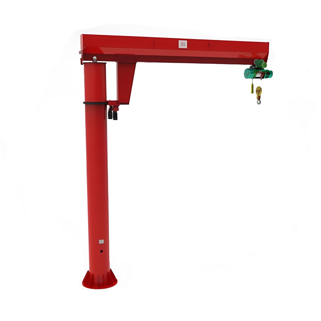 BZD型電動全回轉懸臂起重機是與CD1MD1型電動葫蘆配套使用的一種起重機,本起重機由立柱,回轉臂回轉驅動裝置及電動葫蘆組成,立柱下端通過地腳螺栓固定  在混凝土基礎上,由擺線針輪減速裝置來驅動懸臂回轉,電動葫蘆在懸臂工字鋼上作左右直線運行,并起吊重物。定柱式旋臂起重機由立柱裝置、回轉裝置、旋臂裝置及環(huán)鏈電動葫蘆等組成,主要包括上立柱、下立柱、主梁、主梁拉桿、起升機構(環(huán)鏈電動葫蘆)、回轉機構、電氣系統(tǒng)、爬梯及檢修平臺。立柱下端固定于混泥土基礎上,旋臂回轉,可根據(jù)用戶需求進行回轉。回轉部分分為手動回轉和電動回轉。環(huán)鏈電動葫蘆安裝在旋臂軌道上,用于起吊重物。